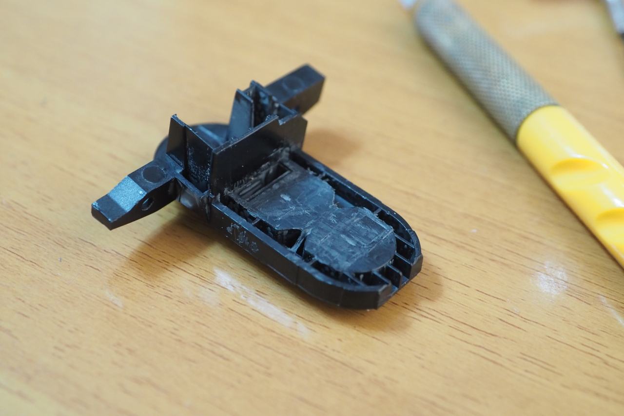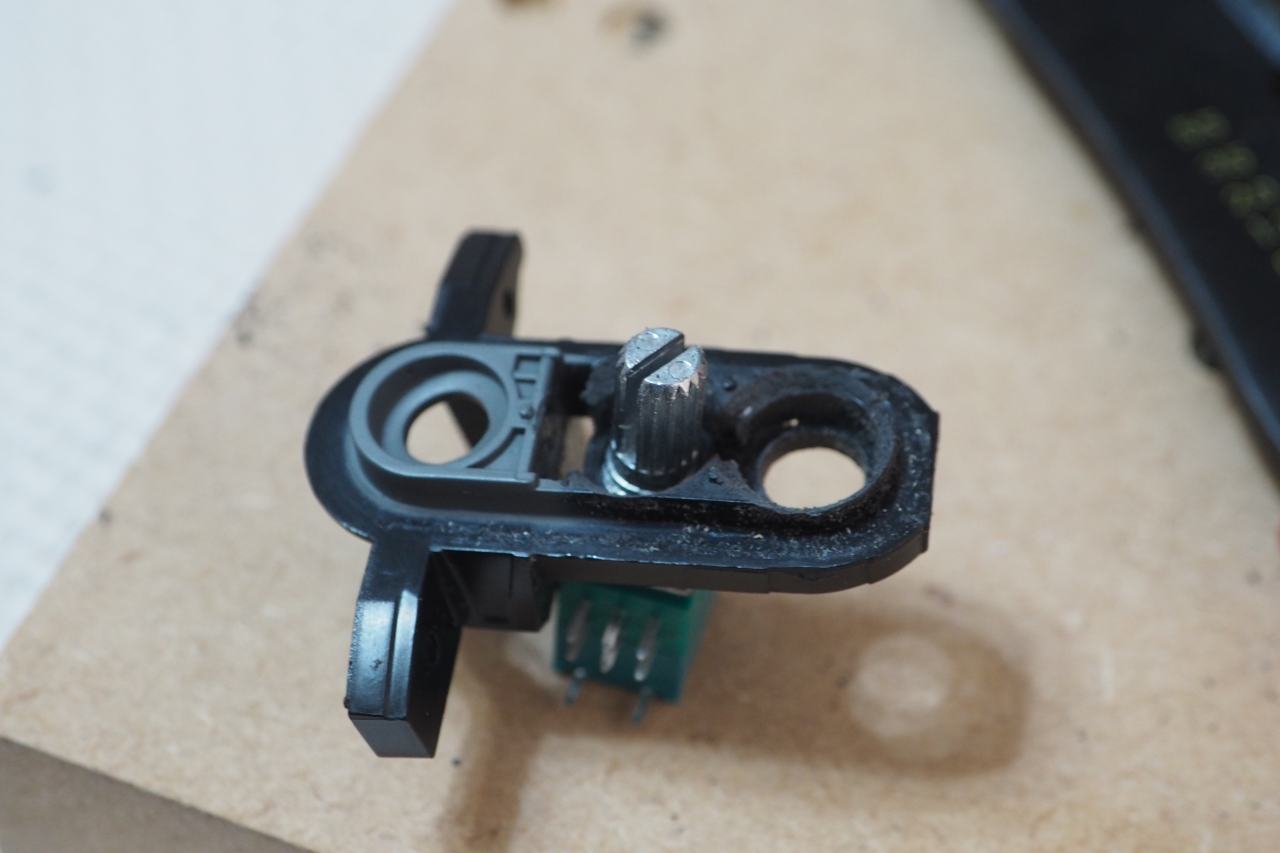 この背面の樹脂突起がジャマ。これがあるとポテンショメーター(ボリューム)が付きません。切除したい。
