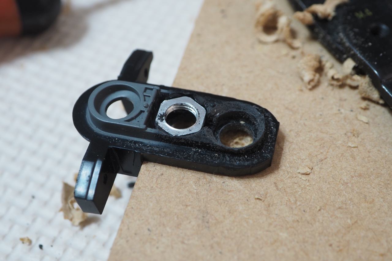 少しずつ当てて慎重に押し込めば、周辺樹脂が溶け過ぎません。ナットの落とし込みに成功です。