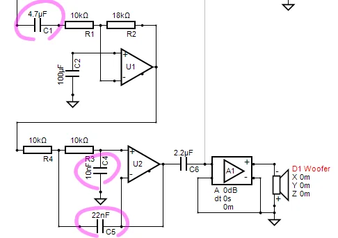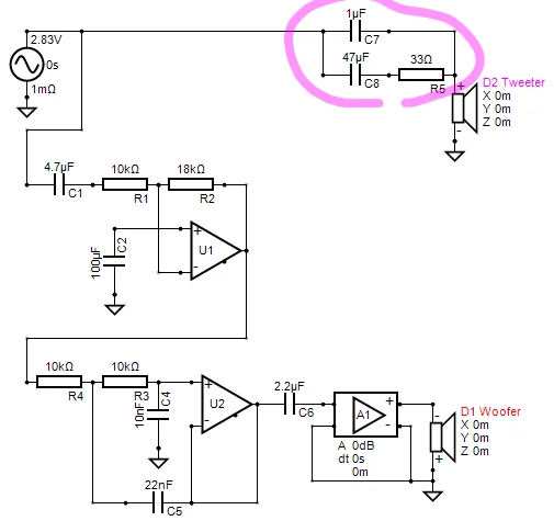 回路解析で、ウーファー側はこんな回路になっていることが判明しました。