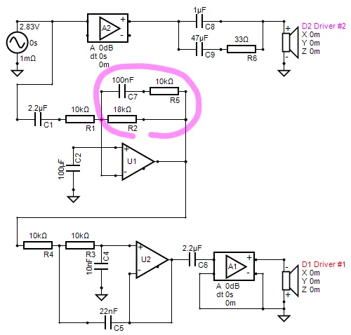 このSallen-Keyを調整して、実効2-3kHzクロスのスロープへ近づけてゆきます。