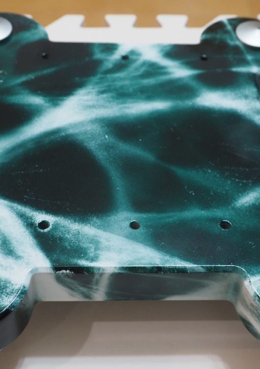 このSub Frameは最初から穴を開けるつもりでした。デザインナイフでけがき、アクリルカッターで溝を掘ってゆきます。スピーカーモジュールの丸穴はアクリルカッターで開けられませんでしたが、こちらは薄いし直線加工だからラク。
