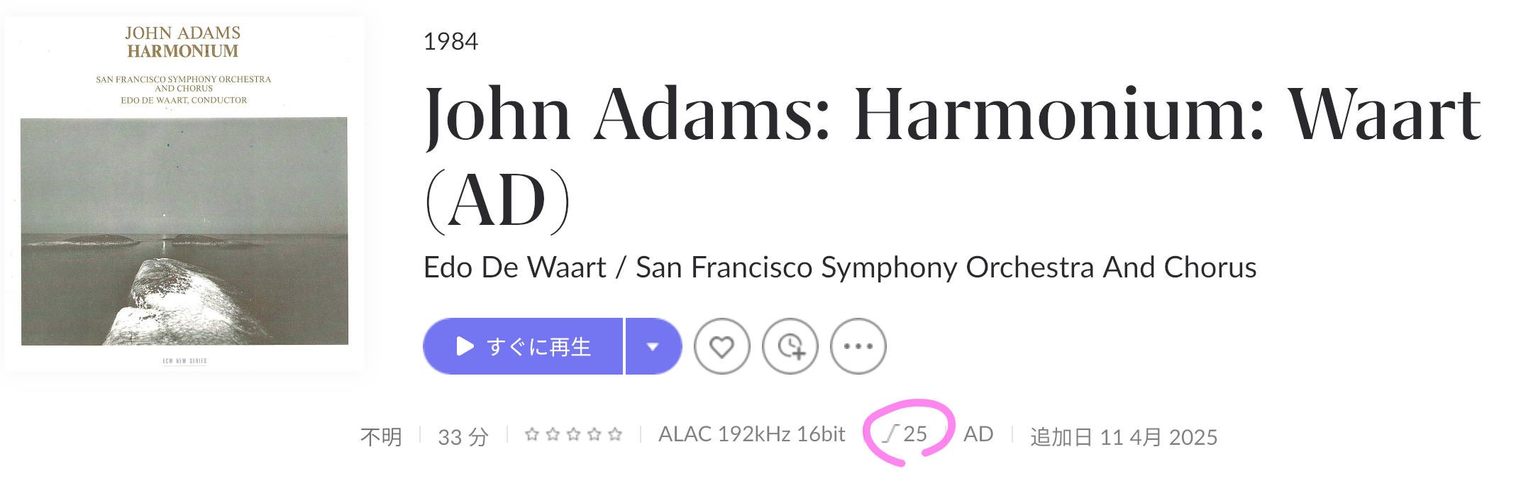 AD取り込み後。Roon上で表記されるダイナミックレンジは25。