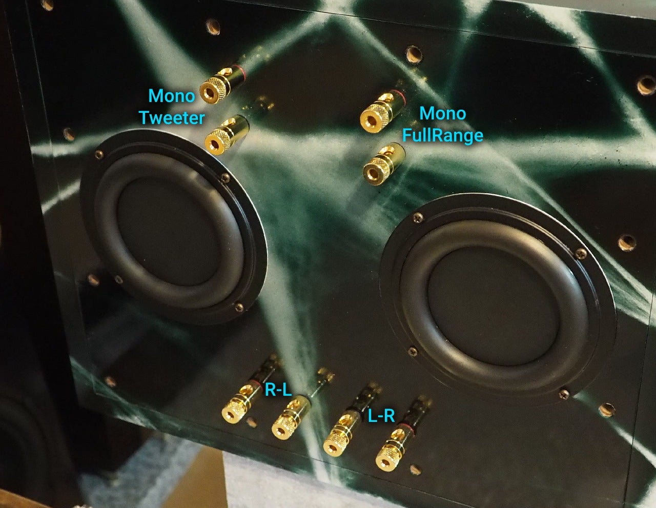 R-L、L-Rが1本だけなのだから、R+Lも1本にするのが正しいかもしれません。最近では世間のマニアの方はDVCを導入してドライバー3本にしてそれを理想と考えているようですが、DVCなど使わなくともマルチアンプ方式の方が正当的です。