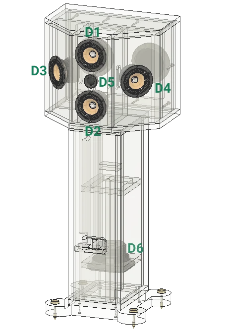 - フルレンジは市場でも特性の優れた3″口径のドライバを採用することにより、4″ (FE系)よりも分割振動が少なく位相特性に優れた系を実現した。さらにセンターchの高域はトゥイーターでカバーすることによって、マトリックススピーカーに最重要な位相/群遅延特性を大幅改善する。