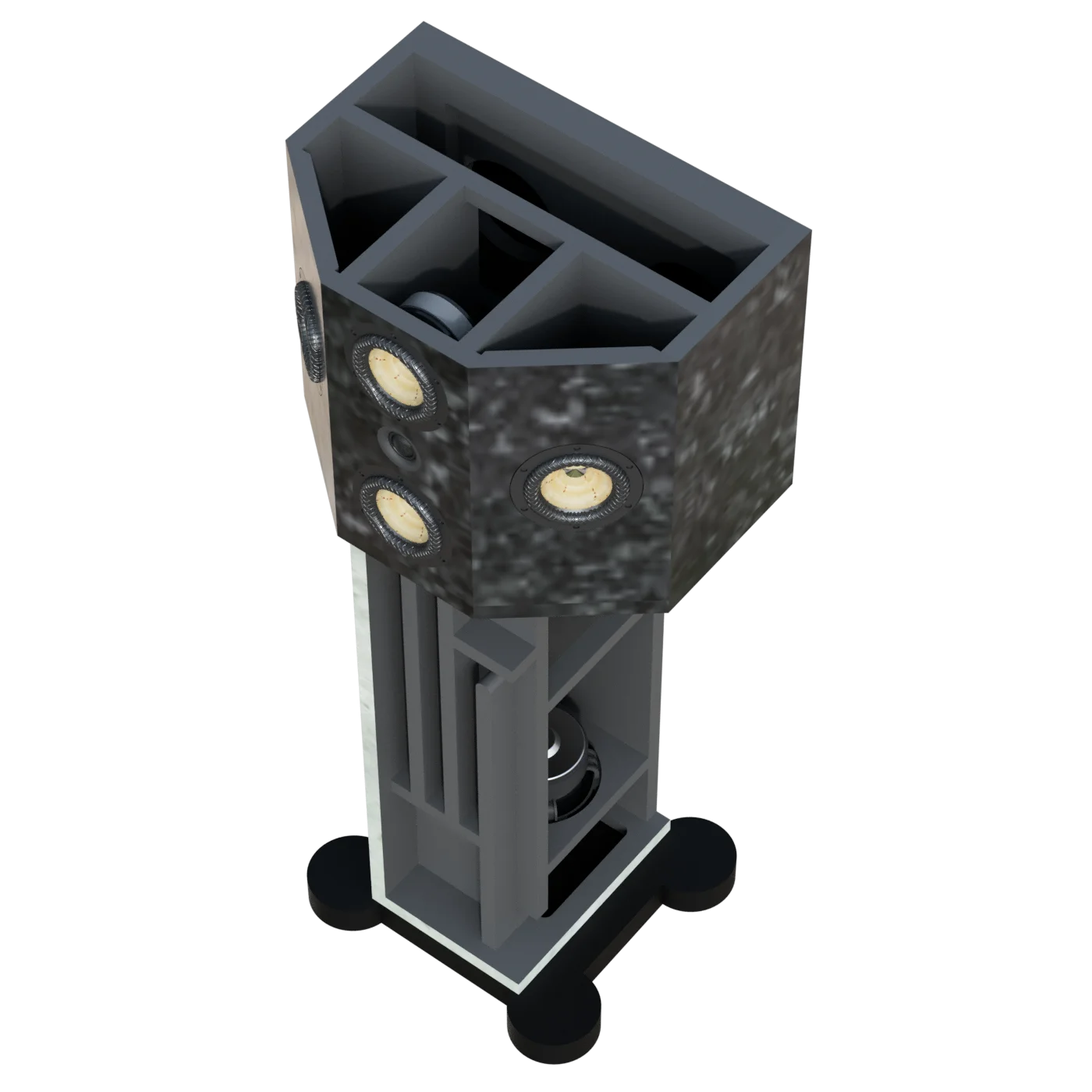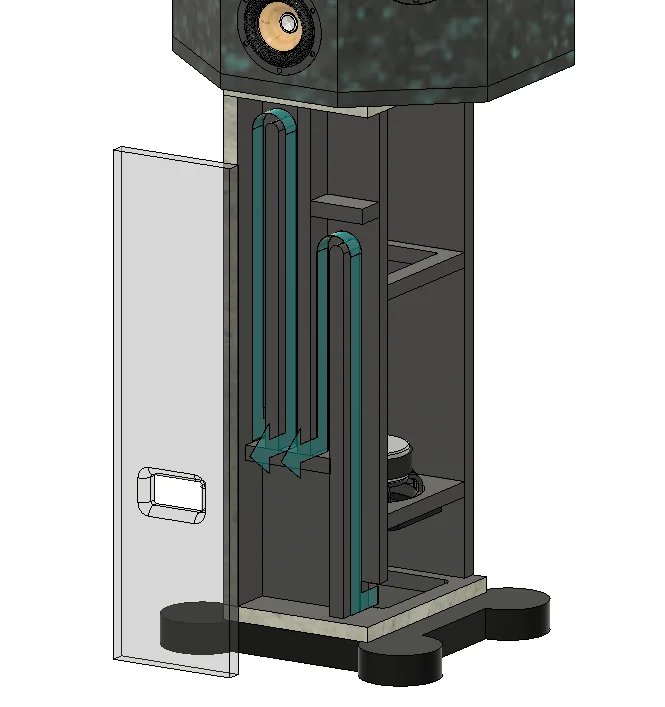 例えば、サブウーファーは6th Orderというだけで黙っていても構造は複雑になりますし、2本の長大なポートを折り畳まねばならないので、さらに複雑に見えます。また、ヘッドブロックは空気室を独立させるために構造が複雑になり、実装/メンテナンス性を配慮して裏蓋を開閉可能にしたため複雑化しました。