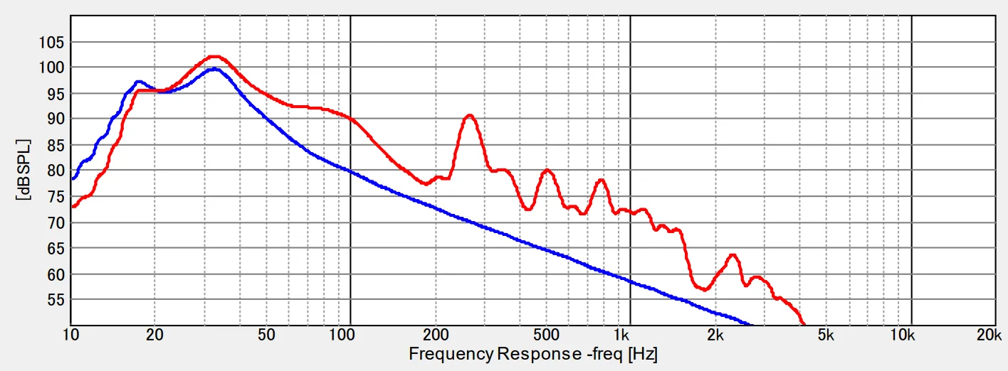 今回のSubはF3が16~17Hz付近に来るのですが、伸ばしすぎです。こんなに伸ばしすぎると何が起きるかというと、まず一層耐入力が弱くなります。また、低い方を欲張りすぎたがために、高い帯域 (50~100Hz辺り)が弱くなってしまう、ヘッド・マトリクスとの接合に腐心しました。ディップができやすくなっているのです。