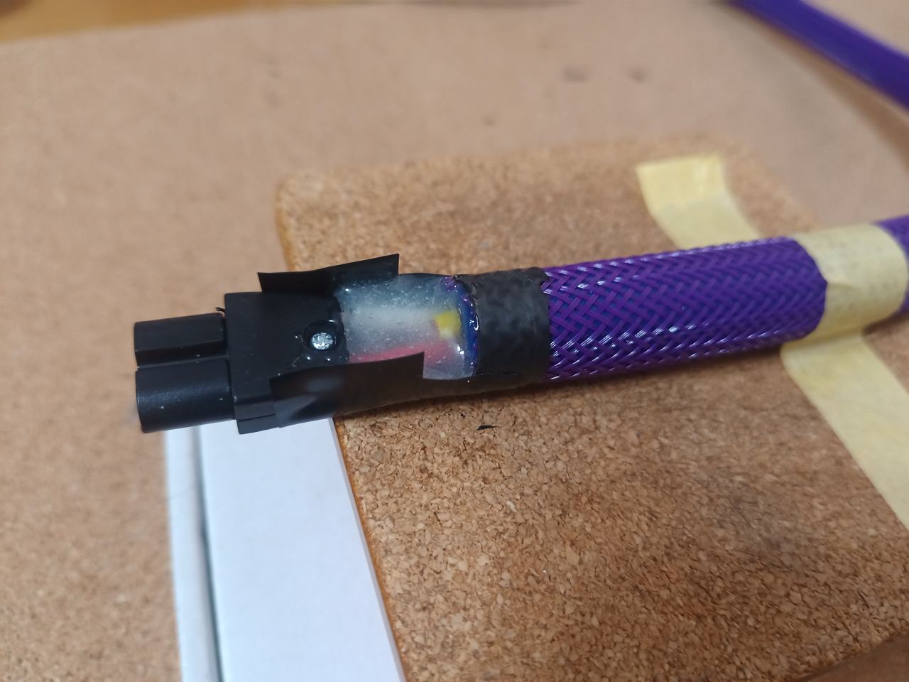 ハンダ周辺補強のために、テープでガイドを作ってからエポキシをたっぷり流し込みます。