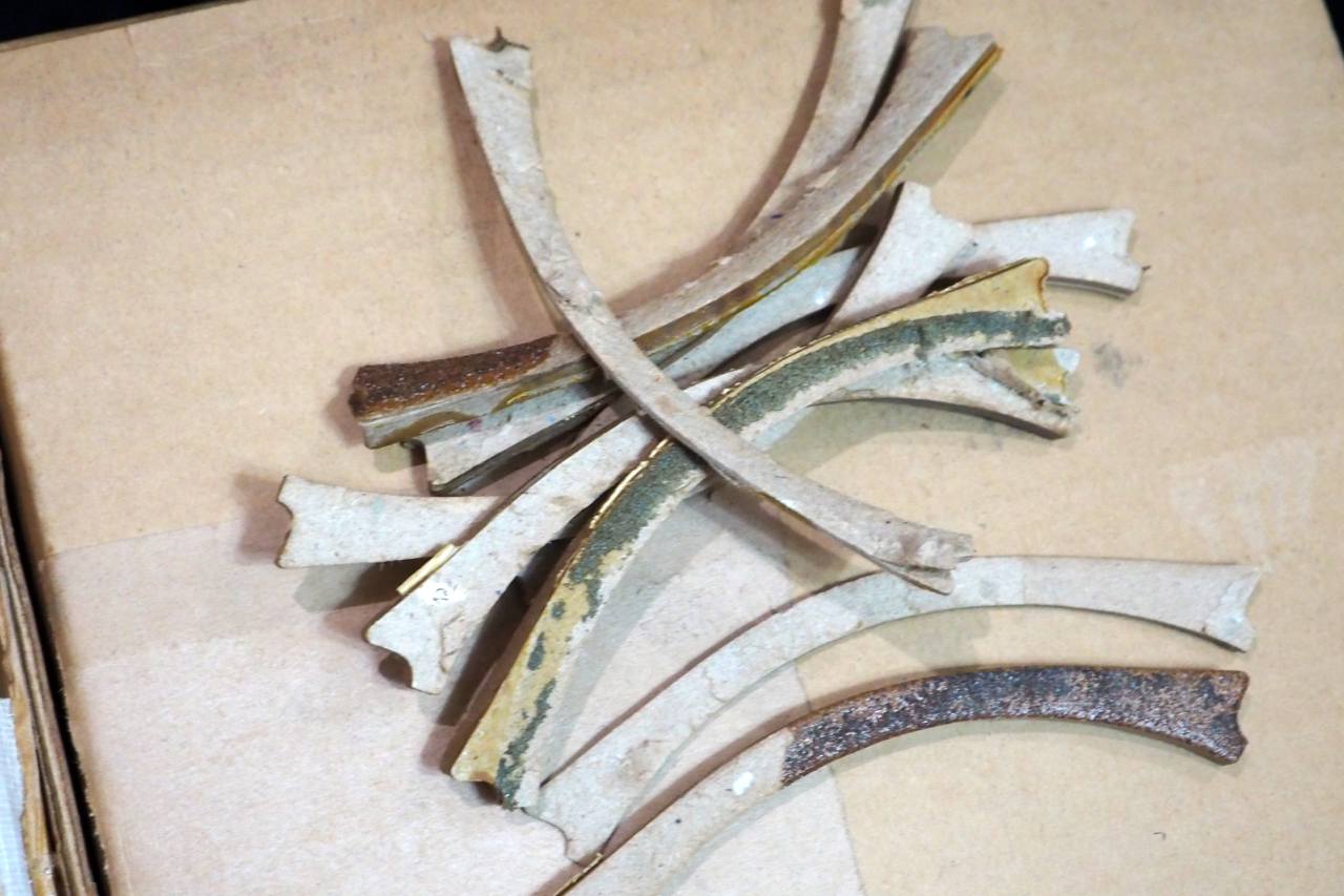 これでもよく落ちた個体。かなり接着剤が残っています。1本作業が完了した段階で、残りの4本は戸外で作業することにしました。サラウンド粉塵がそこら中に撒き散らかされるので、辛抱たまらんです。屋外ならブロアーでも吹き飛ばせます。