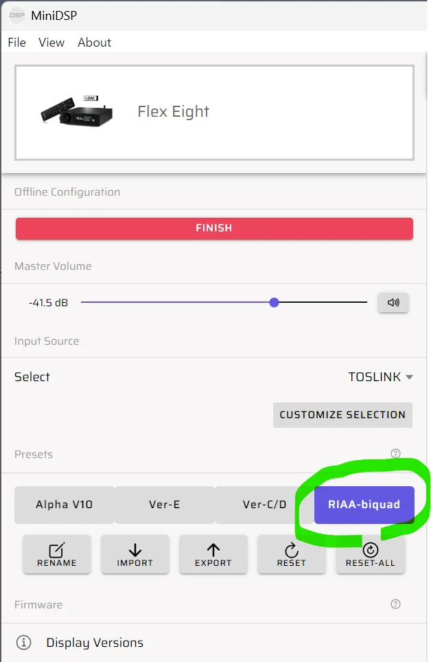 miniDSP FlexEightには標準でBiquad-Filterのナイキストを実装できる機能が備わっています。今回の場合は特に、入力プリプロセシングの中のPEQ内にRIAAフィルターを仕込みます。NASのRoon経由でレンダリングされたプリエンファシス状態のストリーミング信号が、プリエンファシスのままでWiiM Ultraまで転送され、そのままminiDSPに受け継がれ、miniDSPの入力段でRIAAディエンファシスされます。ディエンファシスされた後にminiDSPでXoverされて、パワーアンプへ送り込まれる。