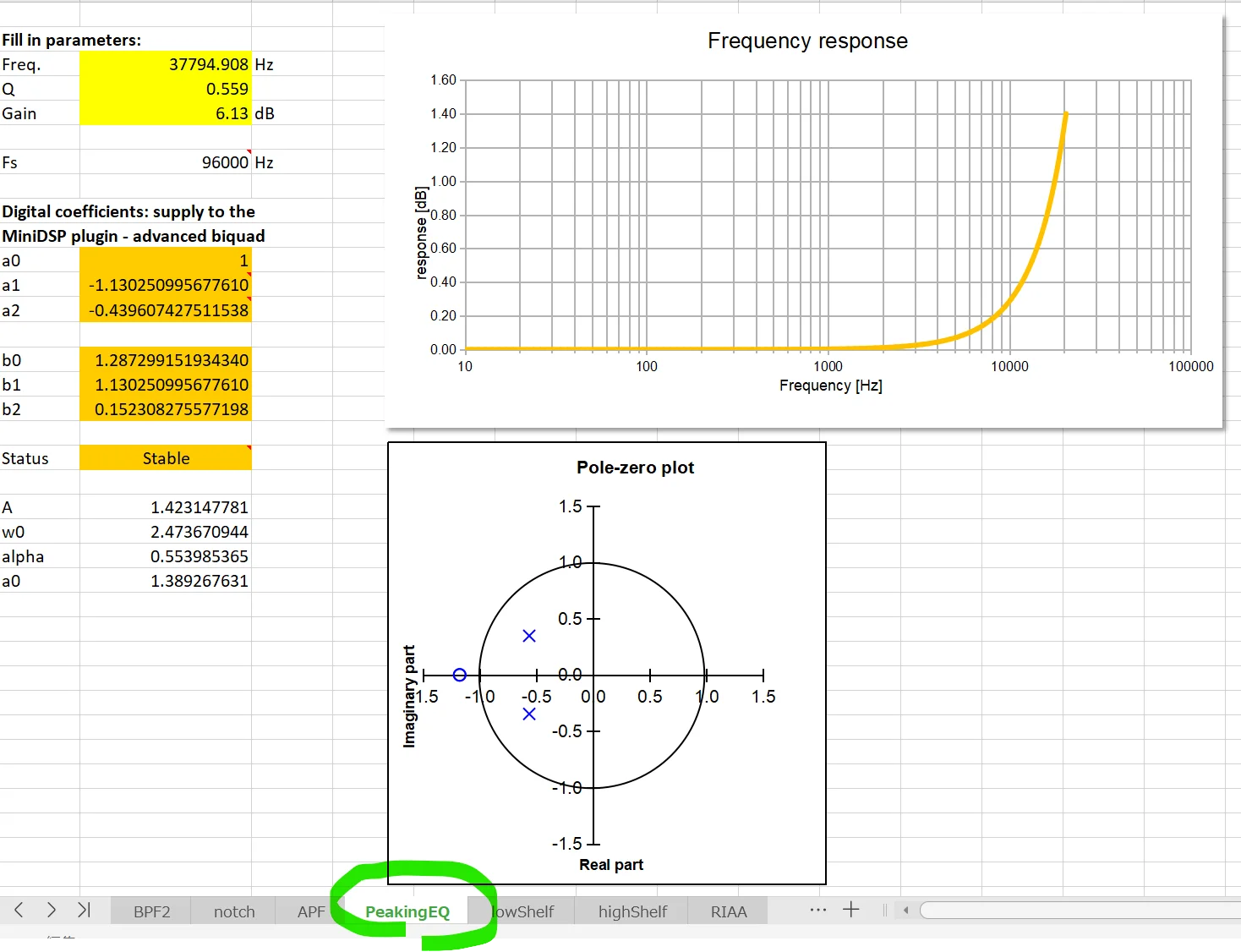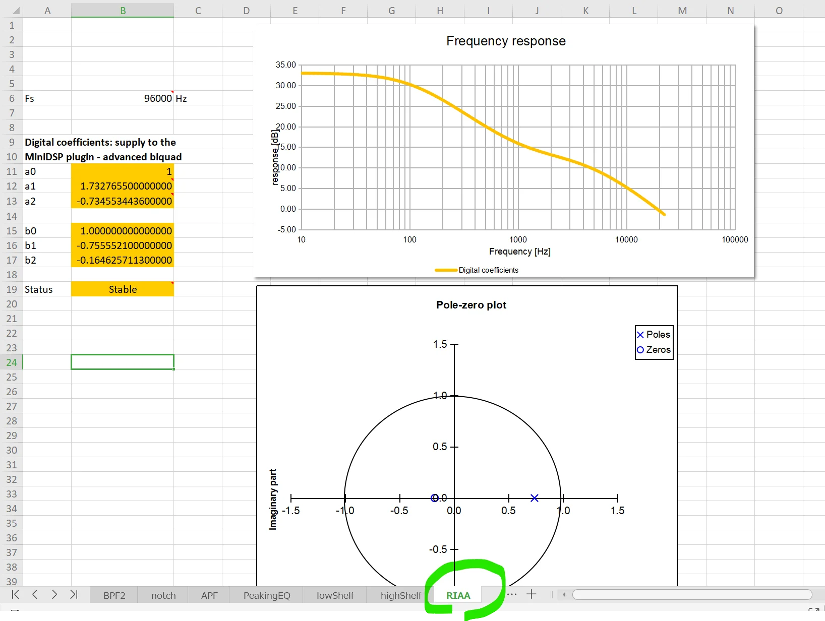 また一方で、miniDSPのBiquadシートには一発でRIAAを再現できるCoefsシートも準備されています。それがこちら。