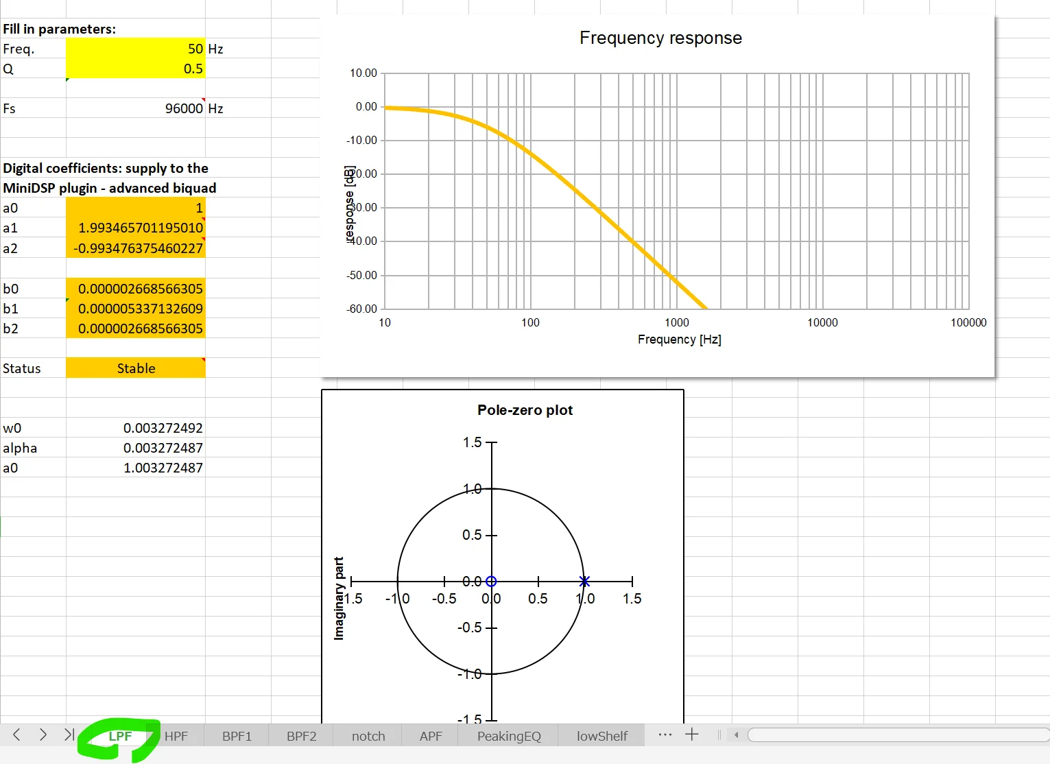 こんな感じ。ヒジョーに易しい。また他方、汎用フィルタ設計用のスプレッドシートはminiDSP側からも提供されている。一応両方を確認してみましたがどちらの係数も結果が同じでした(当たり前か。)。私は最終的に転記の楽なminiDSPシートを使っています。