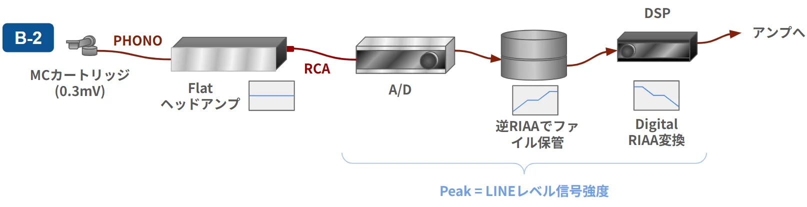 ハイ上がり信号のままNAS保管し、再生時にDSPでリアルタイムRIAA処理する。
