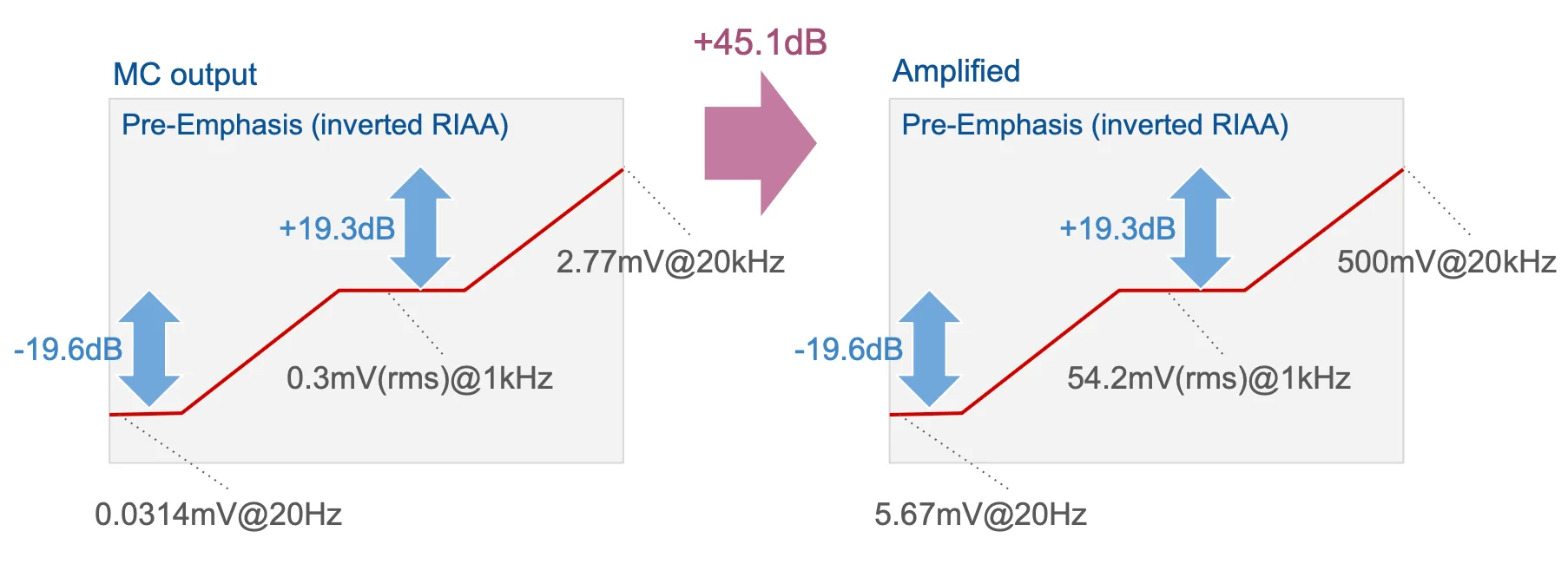 カートリッジの出力は、高域がプリエンファシスされた右肩あがりの特性です。いわゆるinverted RIAA。そして、この時の20Hzは1kHzに対して-19.6dB。高域20kHzは1kHzに対して+19.3dBとなります。