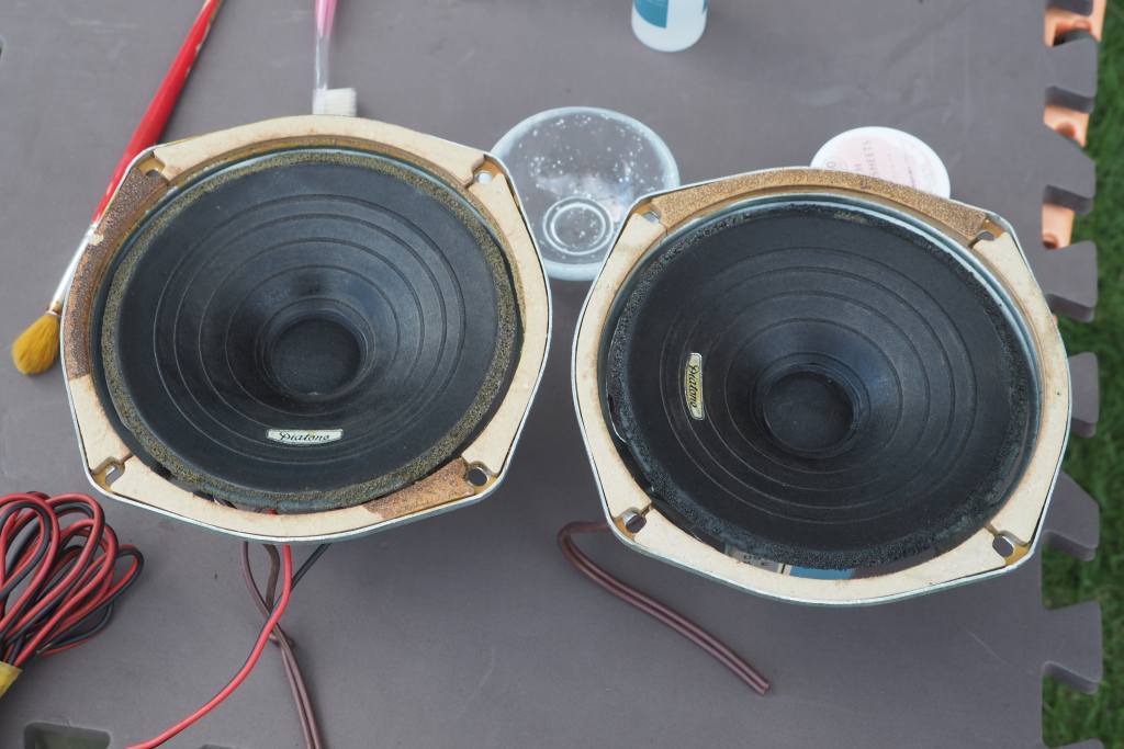 屋外で残り2本のサラウンドごみを除去します。アセトンも使いましたが、除去は「そこそこ」で諦めました。あんまりゴシゴシやりすぎているとメンブレンを痛めてしまうのです。