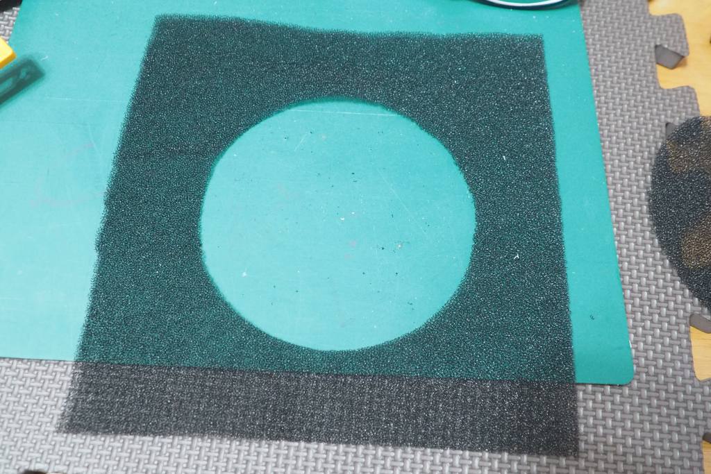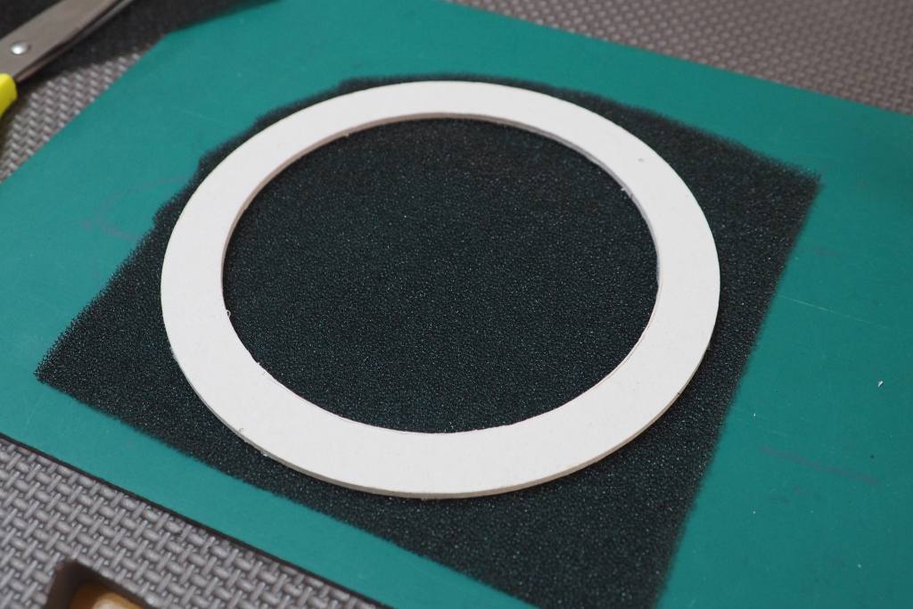 このウレタンはカッターで切るのがなかなか難しいのです。ウレタンの繊維がカッターの刃先に引っ掛かってしまい、ウレタンシートを引っ張るのです。それで、形がよれてしまうというわけ。ハサミの方がむしろずれずに綺麗に切れます。そうだ、外周はハサミで切ろうかな。