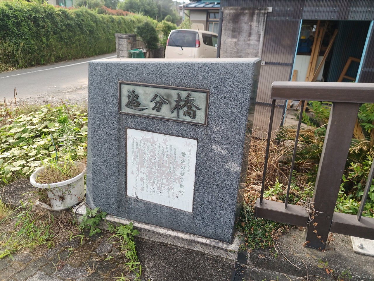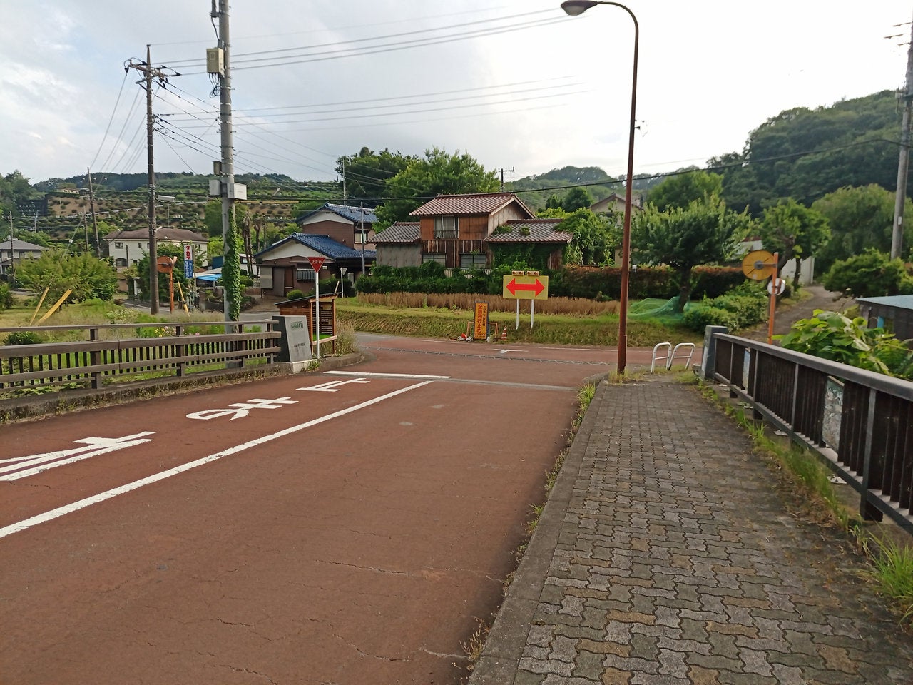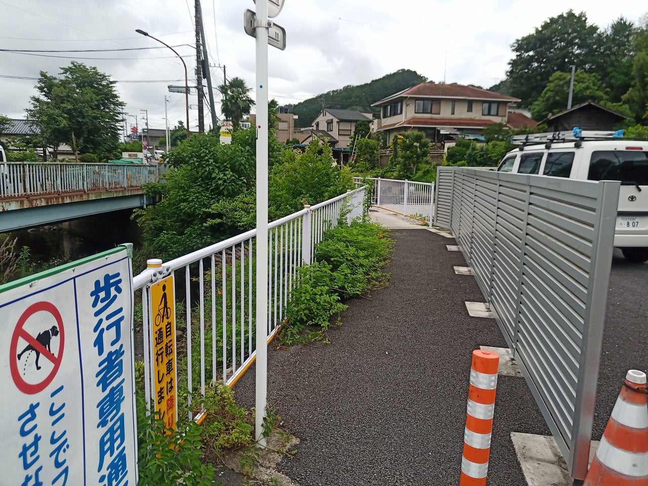 ちっちゃくて看板が読めないが、「この先 下菅生橋は全面通行止め」とある。