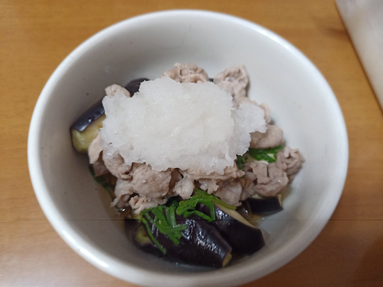 ナスの煮浸しみたいなのに豚しゃぶと大根おろしが乗ったさっぱりメニューです。