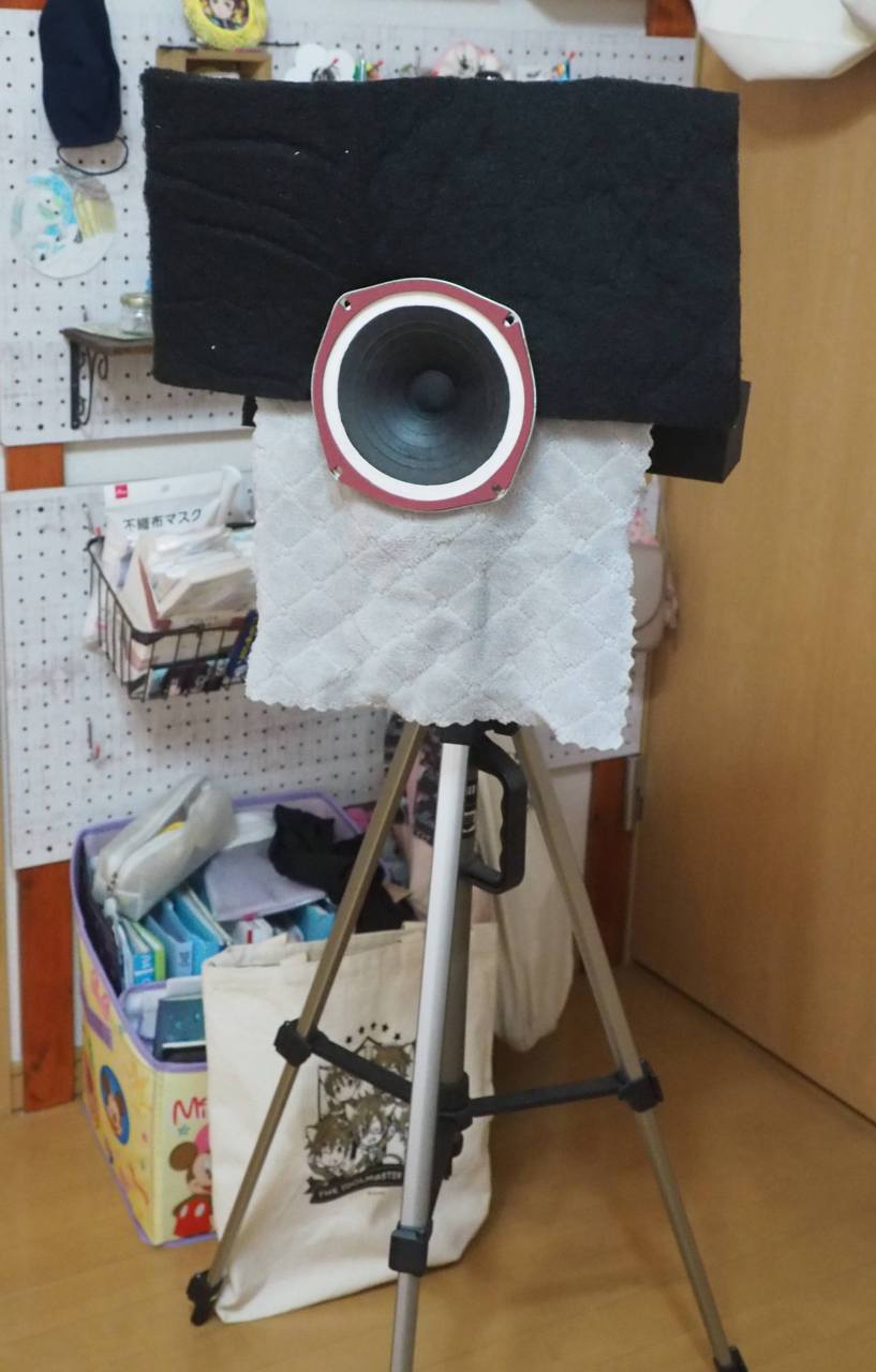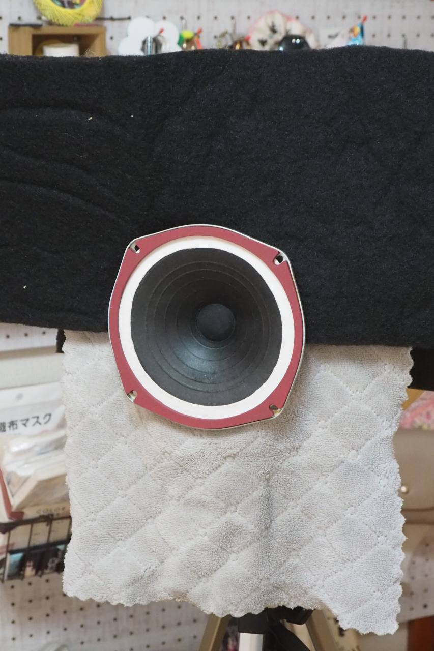 フェルトとぞうきん。こんなものでも無いよりはマシです。バッフルステップを無効化する効果はありません。この場合はフランジ幅がバッフル幅になりますので、だいたい16cmくらいのバッフルに取り付けていることになります。しかし周辺吸音でディフラクションを最小とする効果はあります。