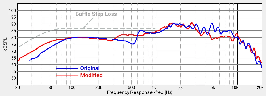 総括すると、オリジナルはそこかしこにどたばたと暴れが多いが、トータルではバランスが取れている。対して、魔改造品は大人しいし極端な暴れはないが、高域が落ち込んでいるし1-4kHzに山が出来てしまい、見かけ上のフラットネスが足りない。どのみちBSCは必達なので、ついでにピーキングフィルタでこの山を潰してしまえば問題とはならないでしょう。