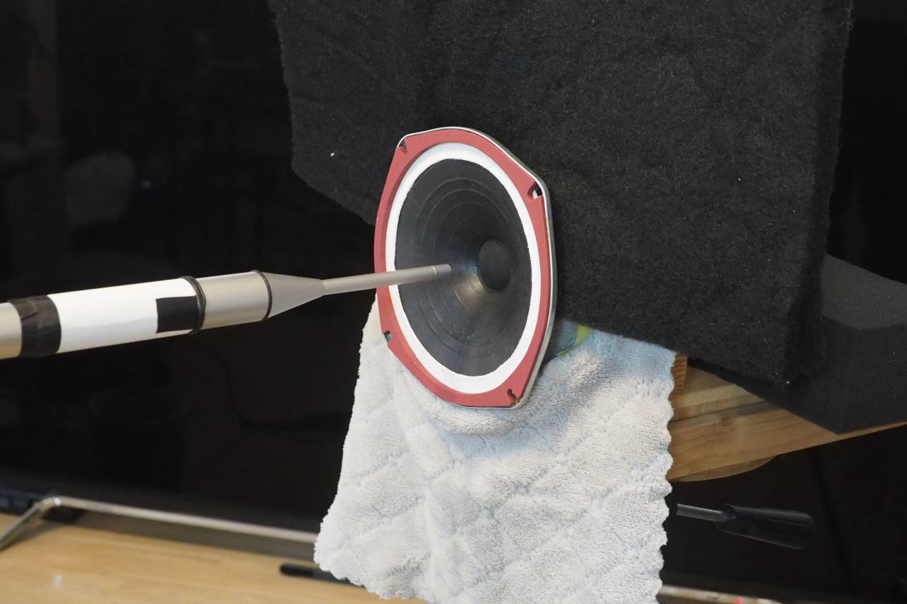 写真では吸音に隠されて見えませんけれど、木製のクランパーがドライバーのマグネットを挟み込んで固定しているのです。このクランパージグで、どんなドライバでも測定ができるようにしています。(かれこれ15年選手?)