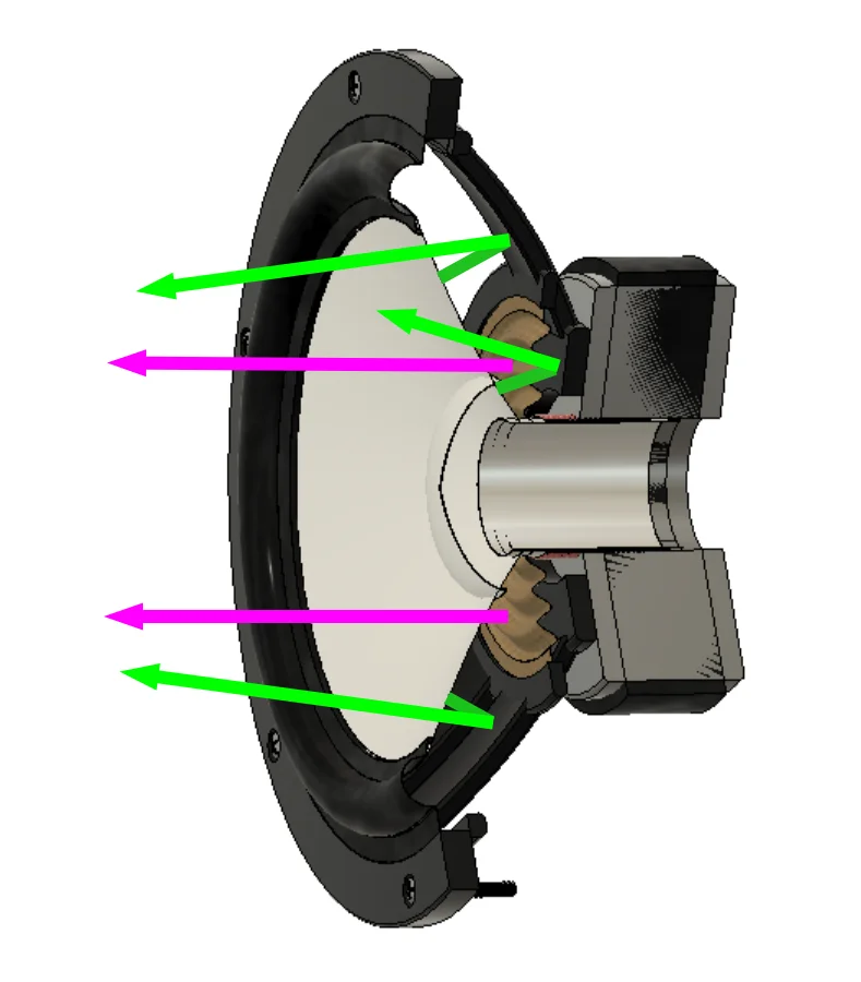 まず、スパイダーは織布などの損失が大きく音の出にくい素材を使ってはいますが、それそのものが発音源になったりします。次に、メンブレン背面から出た音圧はバスケットやマグネットプレートで反射してメンブレンまで戻ってきます。