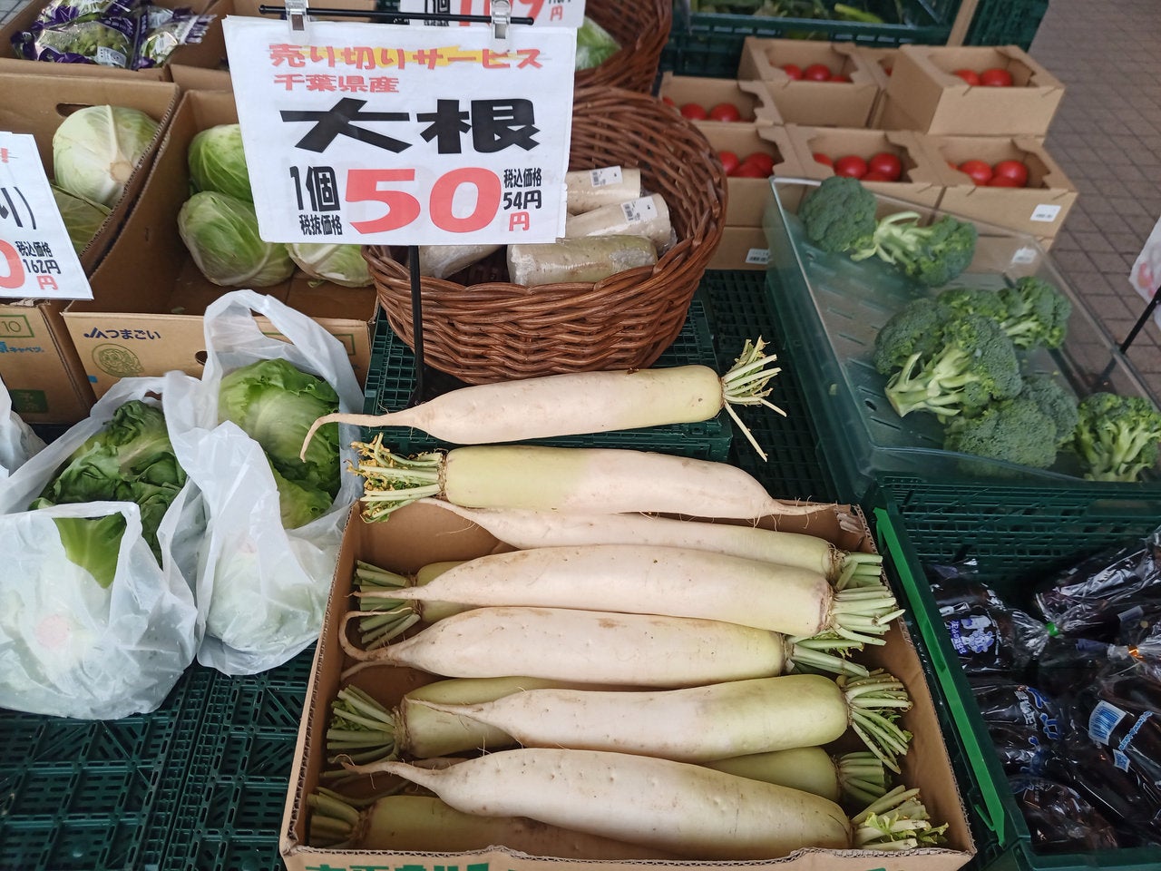 こちらは、小ぶりの大根ですが1本50円。ハーフではないです。1本。なんで「1個」表記なのかは謎ですが(笑)