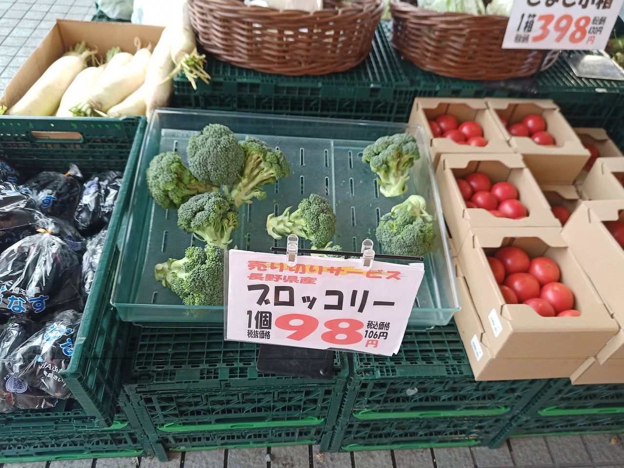 そう小さくもないブロッコリーが98円。他店は150-198円ですから差はつけています。