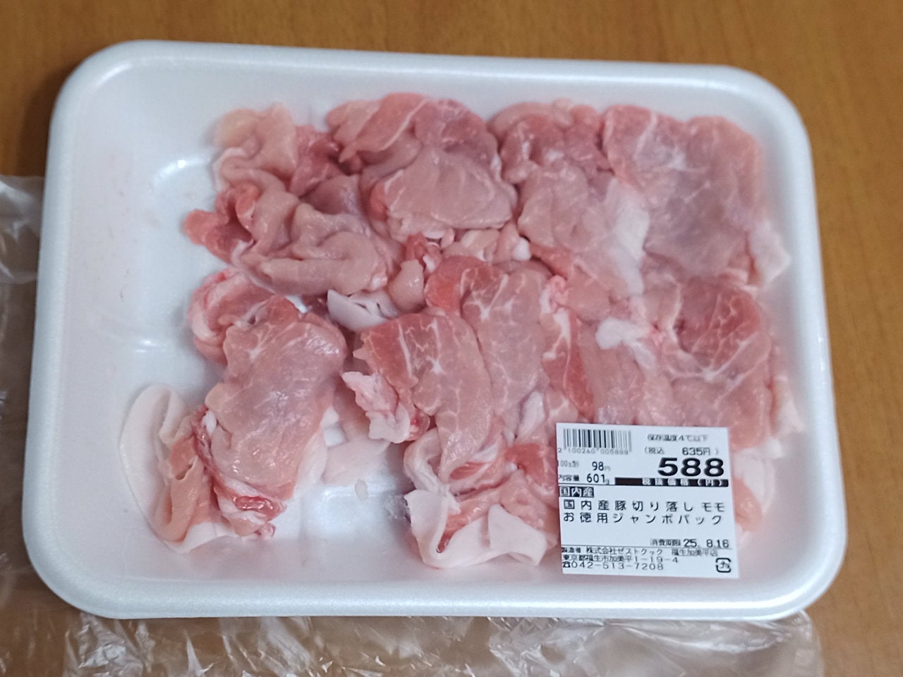 この100g 99円のブタもも切り落としは新鮮で他店より美味しいのだそうです。
