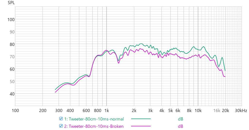 これは両者の比較プロットです。破けていた方のトゥイーターは特に高域側の能率が落ちてしまい、結果論でフラットに見えいていたというね。皮肉です。全体的に凸凹が目立ちますので、派手で闊達な音が出そう。という予想をしておきます。