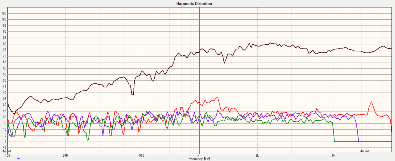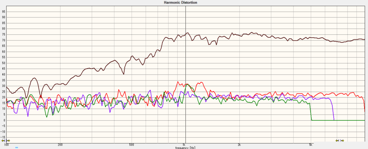 歪率は悪いところで2%、良いところで0.5%といった所です。先日測定したNS-1000Mミッドに比較するとだいたい倍以上は歪みが多く計測されました。