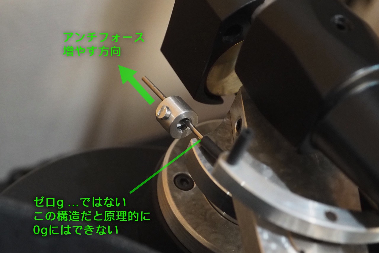 そこが「針圧0g」と思いたい所ですが、この構造だと原理的にアンチフォースを0gにはできません。錘を外してしまえば限りなくゼロにはできるかも知れませんが・・・。