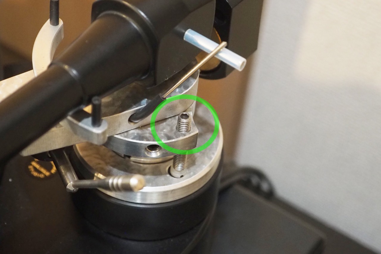 まずはトーンアームベース根本にあるはずの2箇所のボルトを緩め、大雑把な高さ調整を済ませます。そこは「出来ている」前提で話を進めます。