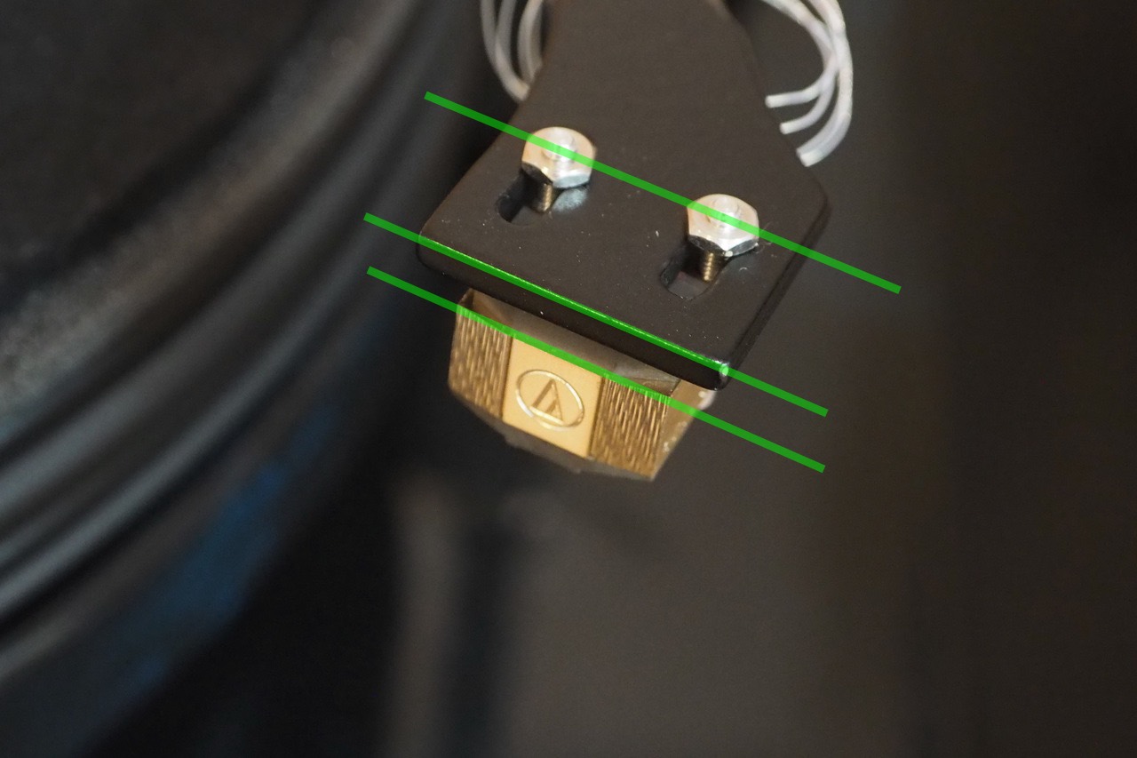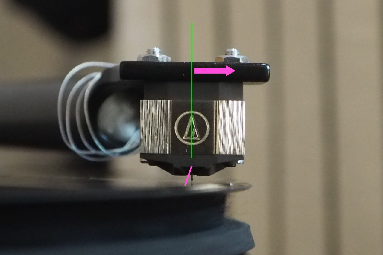 簡単に言ってしまうと写真のように、再生中のカートリッジを正面からみた時の鉛直中心線と、カンチレバーの傾きが一致して、一直線になれば調整成功です。簡単でしょう?