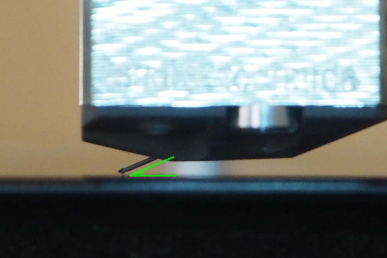 ただし単純な目視確認だと、どうしても人間には「視差」と言うものがあって判断の狂いが生じやすいです。カメラでズームして撮った方が分かりやすく、確実であったりします。1枚だけでなく連続で何枚も撮影しておきます。再生中にカートリッジが移動してきて”アングルが一致”する点を探します。複数の全ての写真でカンチレバーが同方向に傾いて見えたら、調整失敗ってこと。