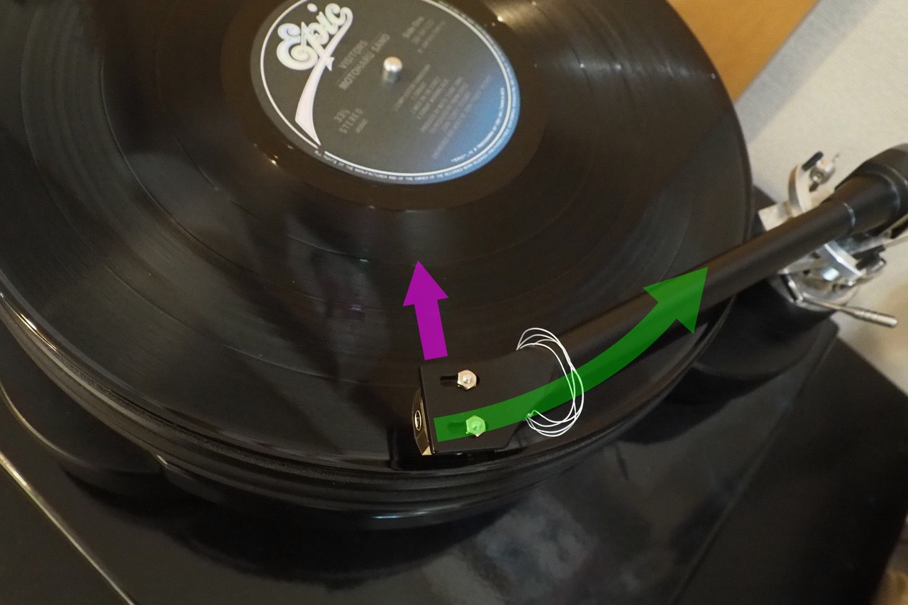 緑色がスタイラスチップに掛かっている摩擦力の方向です。摩擦力はレコードが回転していないと生じません。この時に「カートリッジとアームで角度が違うから」幾何学的なベクトルがずれてピンクの方向へ力が掛かります。これがスケーティング・フォース(インサイドフォース)です。