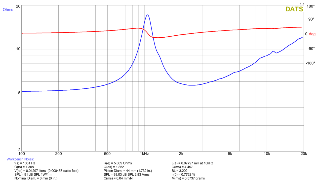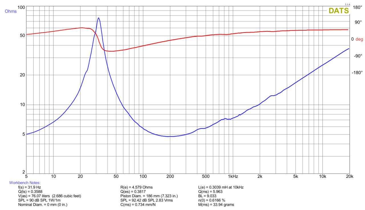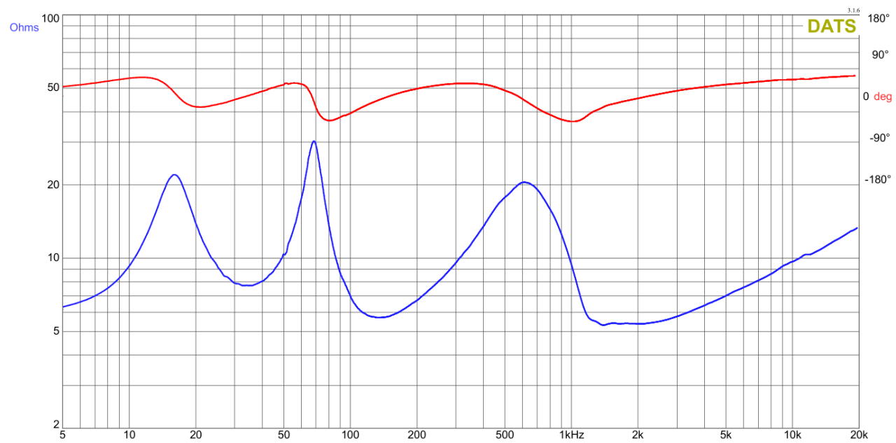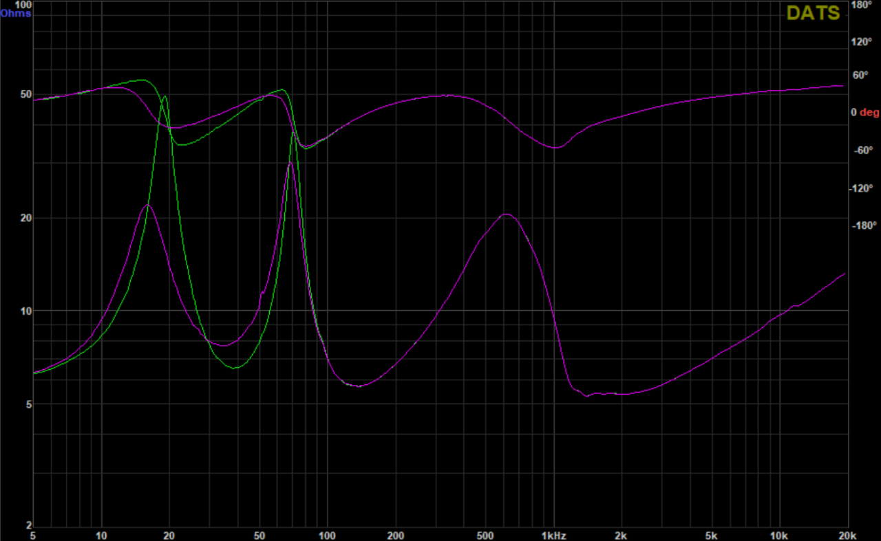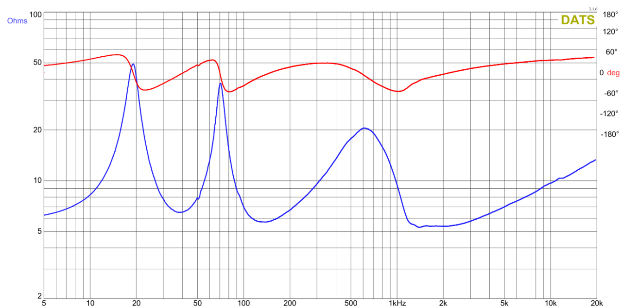 これはポートに吸音材を入れていない、どノーマルでのインピーダンスです。