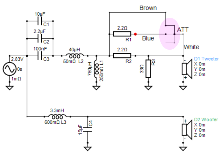 このトゥイーターはちょっと高域端、チタンドームの持分の主張が強いんですね。かなりちりついてしまうし音質城もネックになってしまう。そこで、高域端だけをロールオフさせるインダクタを入れて平らに均したかったみたいです。それでも持ち上がっていますけどね。