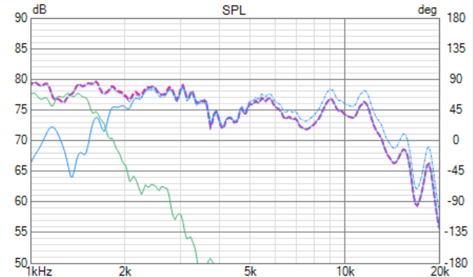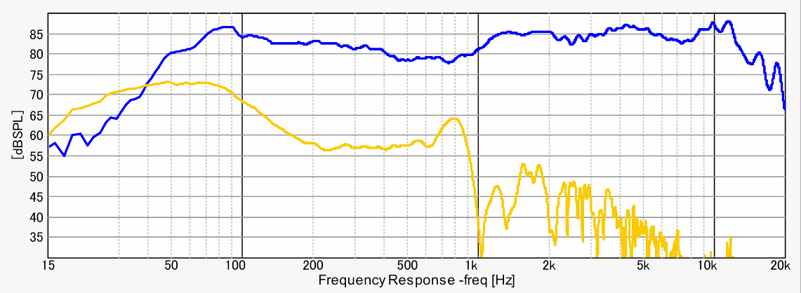 総合特性は聴感の想像とやや一致します。やや吊り橋で、高域と低域に特徴というか個性があって、主張が強い感じがする。ただ、思ったよりもずっと整っている。これは立派です。ポートにフェルトを突っ込んだ方の測定はしていませんが、低域のピークとクセがなだらかに抑えられて、ほとんどの一般人にとって支障のない音質になるんじゃないでしょうか。