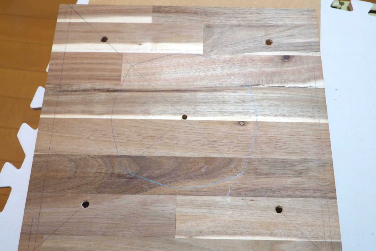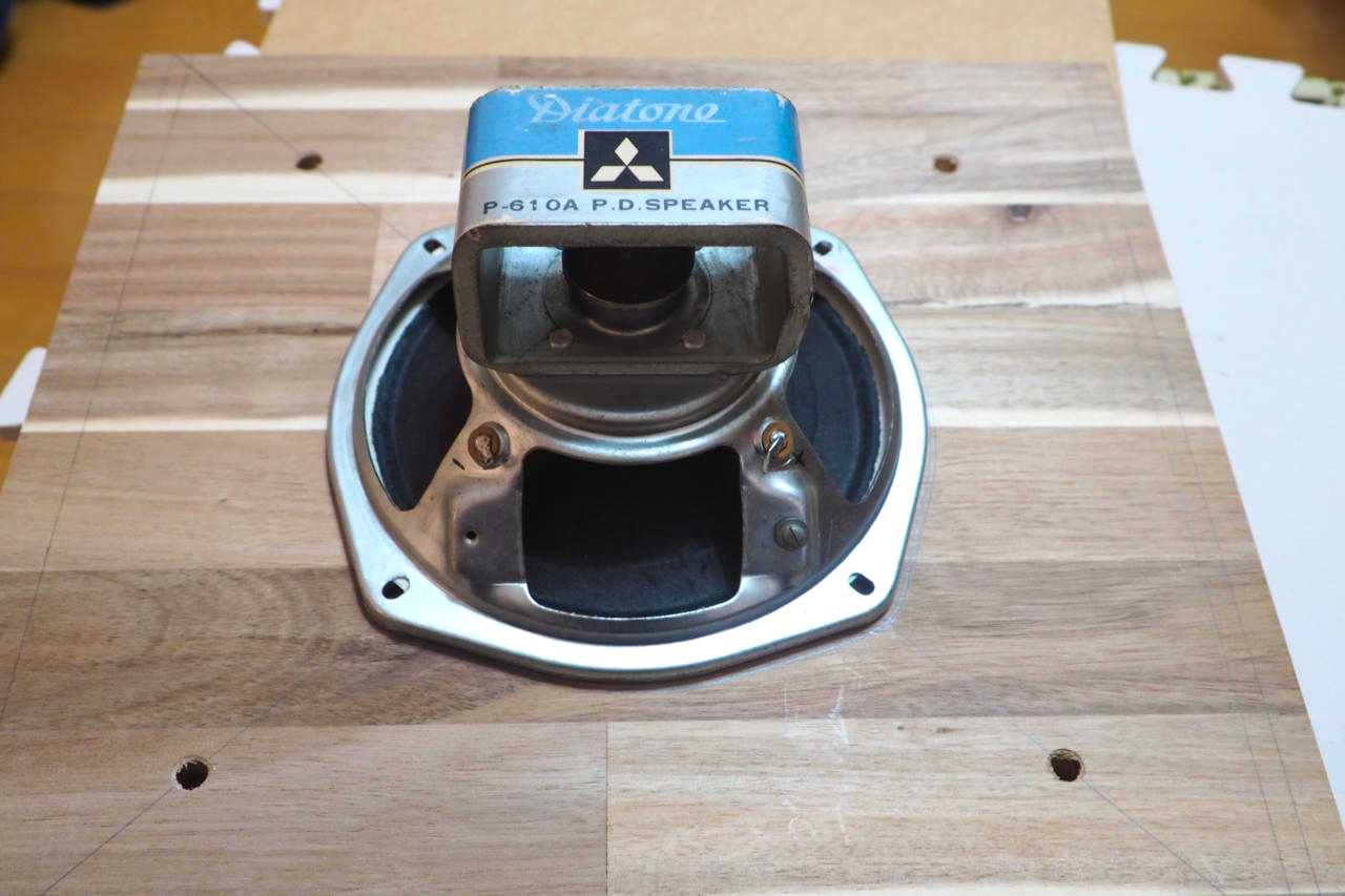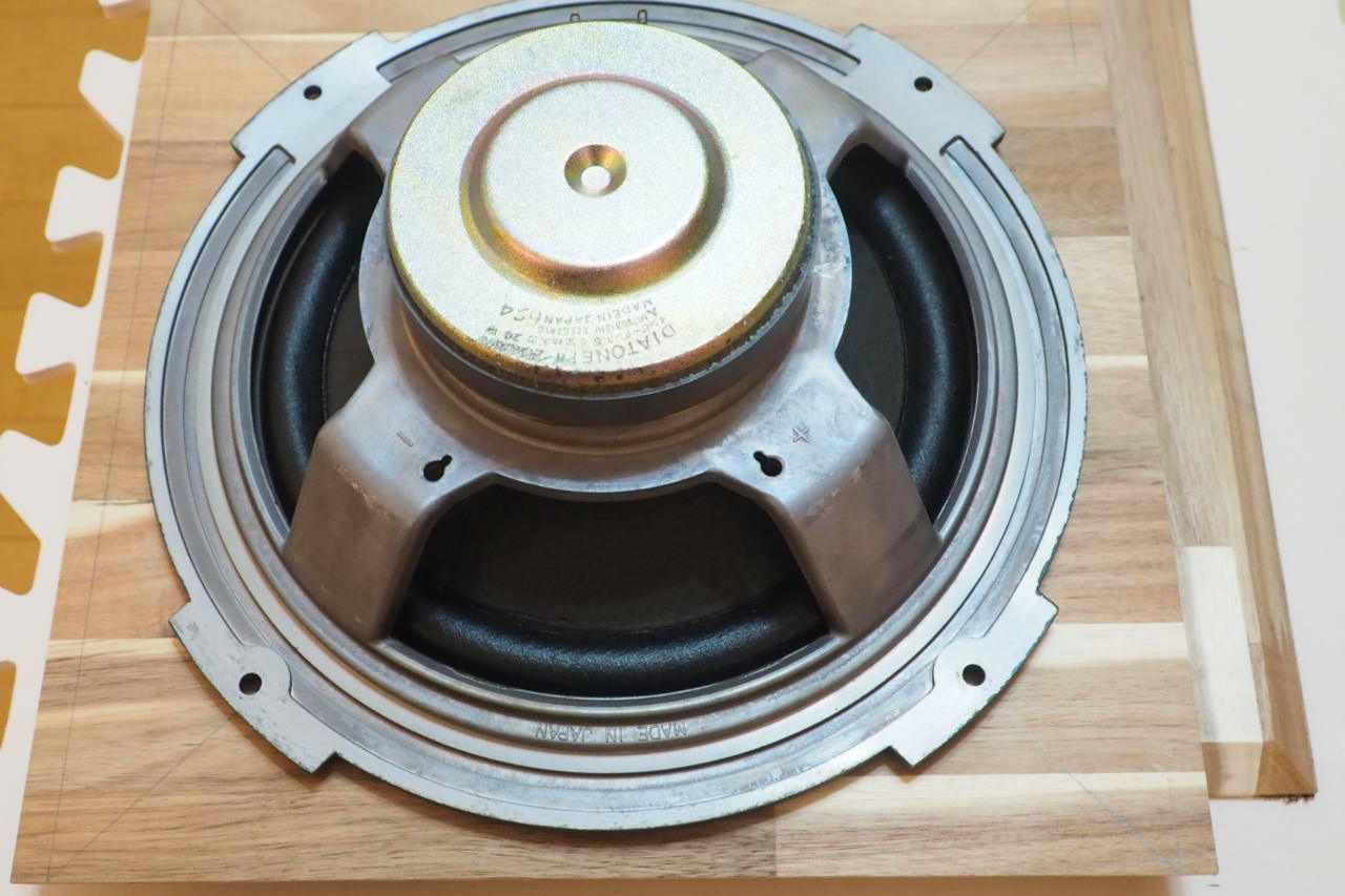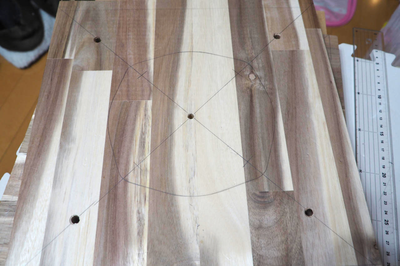 その罫線上にちょうど載るよう、DS-25Bのウーファーを乗せてからフランジの穴位置を罫書きます。