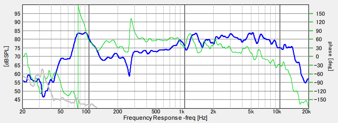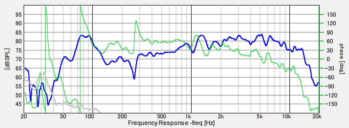 グレー線は環境暗騒音のレベルです。ですから20Hz付近のレベルはスピーカー音圧ではなく無視してください。