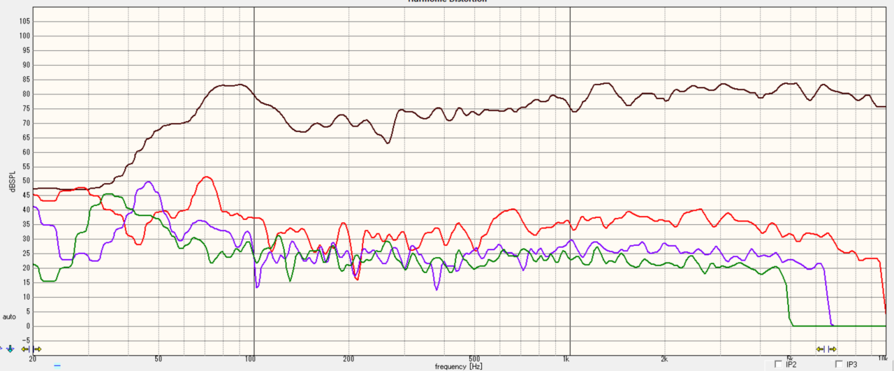 歪率が重低音域では22%。低音域で5%。中低域〜中高域で2%〜0.8%といったところです。