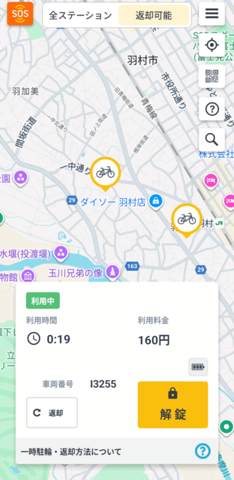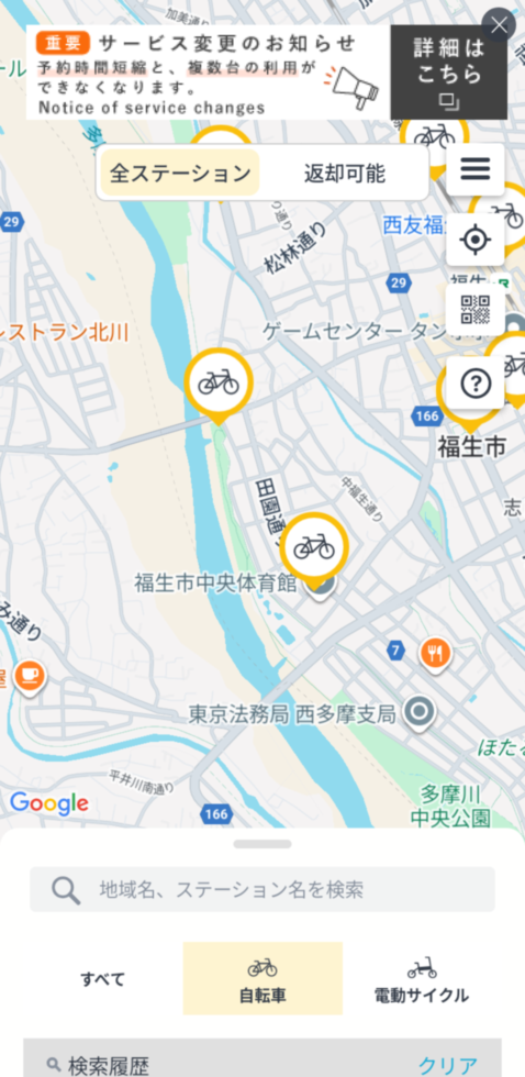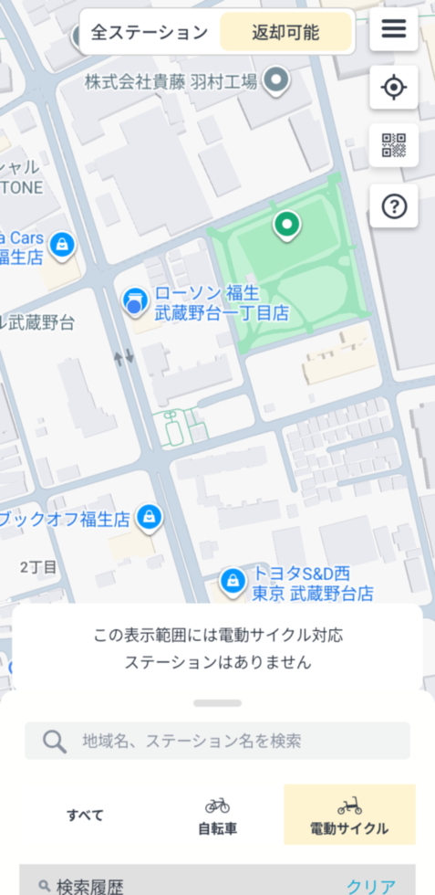 アプリを起動するとこんな風にステーションのある位置を示してくれます。