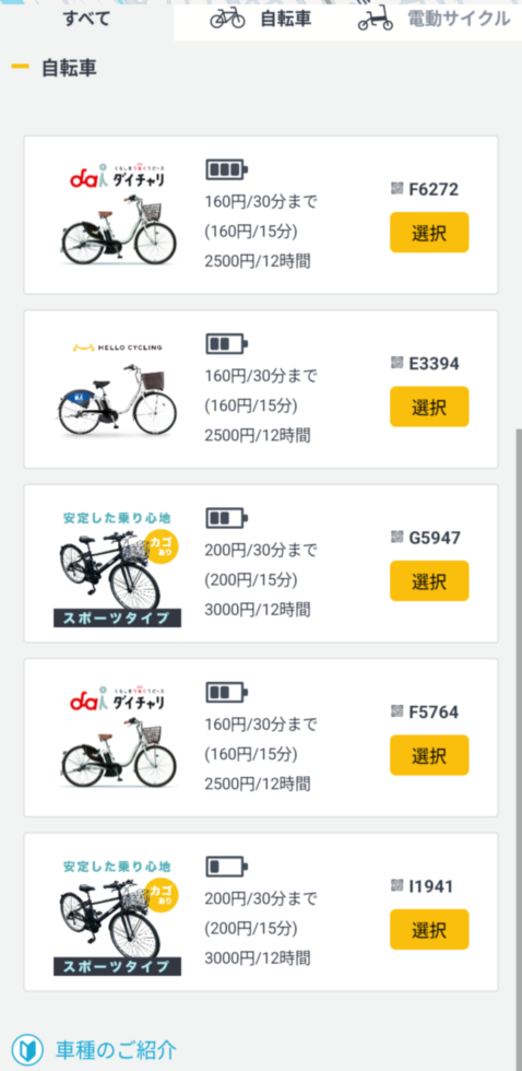 ステーションの中から好みの自転車を選択します。スポーツタイプは基本料金が200円。一般車は160円と、価格には違いがあるようです。私は、ステーションに置いていなかったので一般車両を選択しました。料金は下記のようになっています。