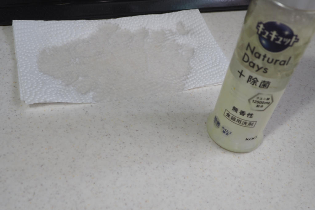 20分ほど放置してから、キッチンペーパーを取り去ってみました。上図はまだ中性洗剤が残った状態です。