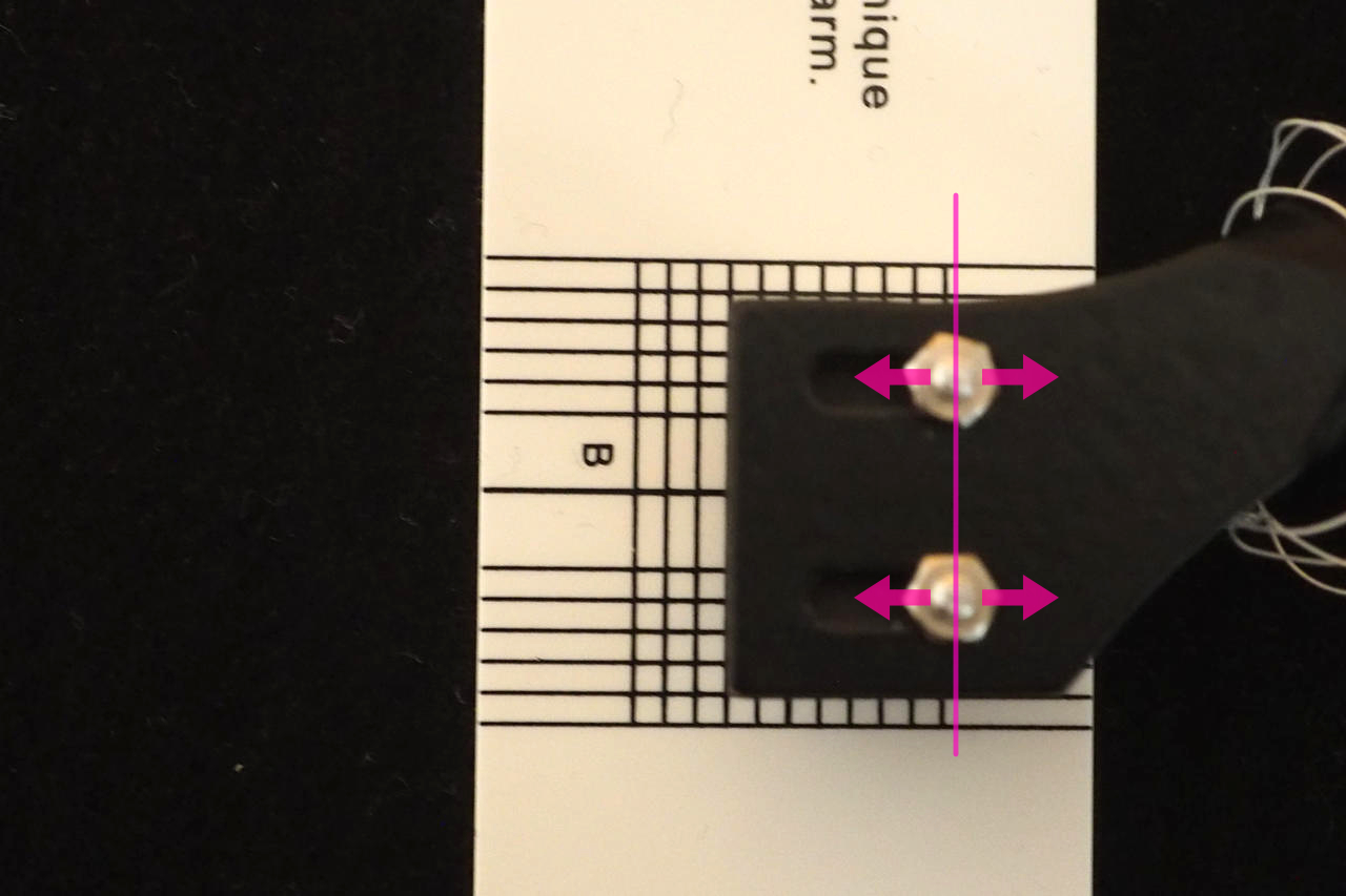 カートリッジの取り付け位置をシェル上で前後させることで、水平が採れる箇所を探ります。カートリッジをシェルに対して歪めてしまうのはオフセット角が狂うのでNG:あまり好ましくありません。