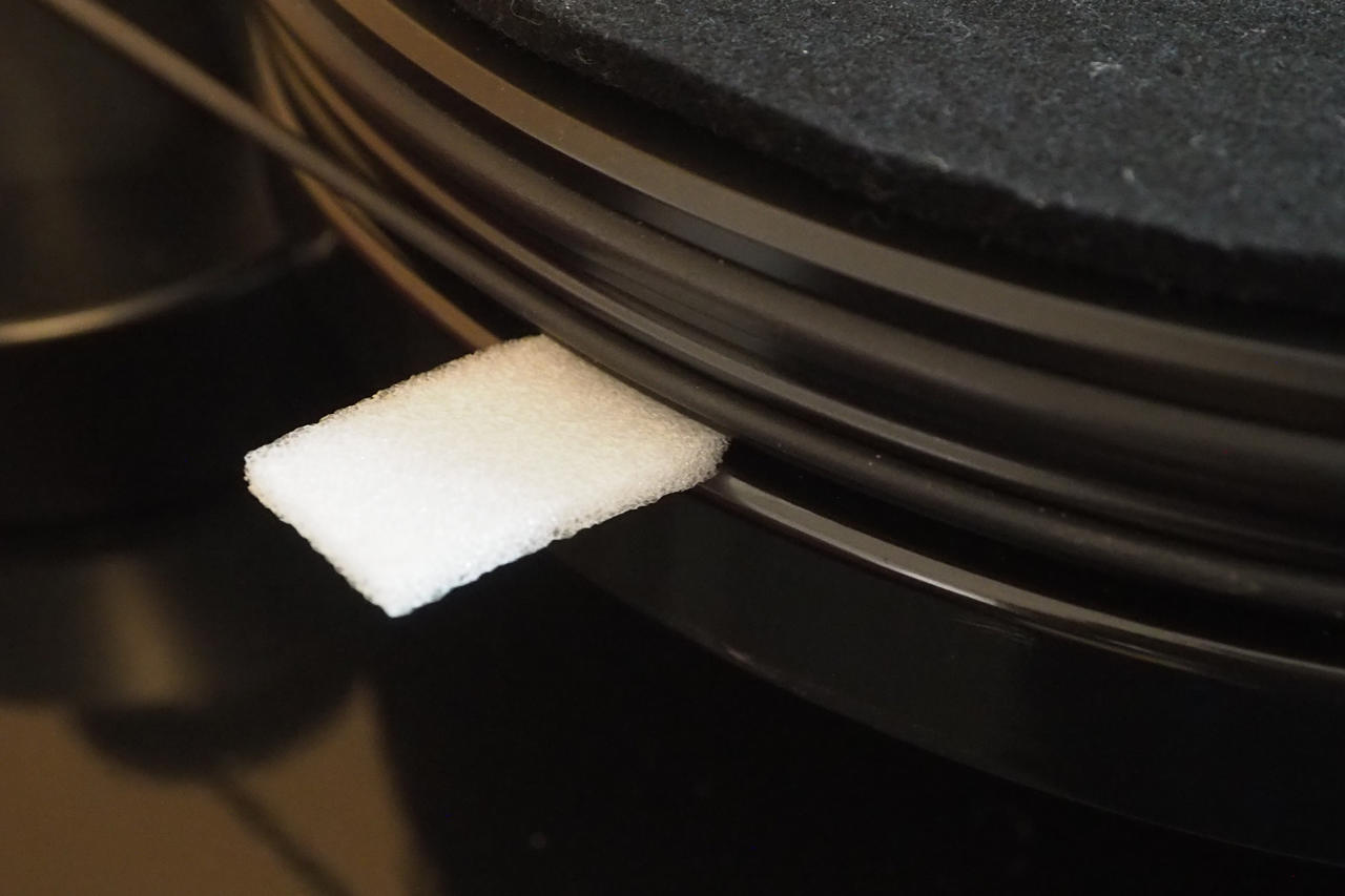 調整中に手が触れてプラッターが回ってしまうとスタイラスにダメージが出ます。そこで、図のようなスポンジを咬ませてプラッターをロッキングしておくと良いでしょう。安心して作業ができます。