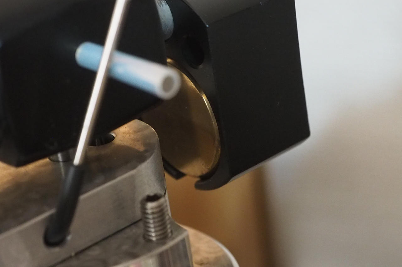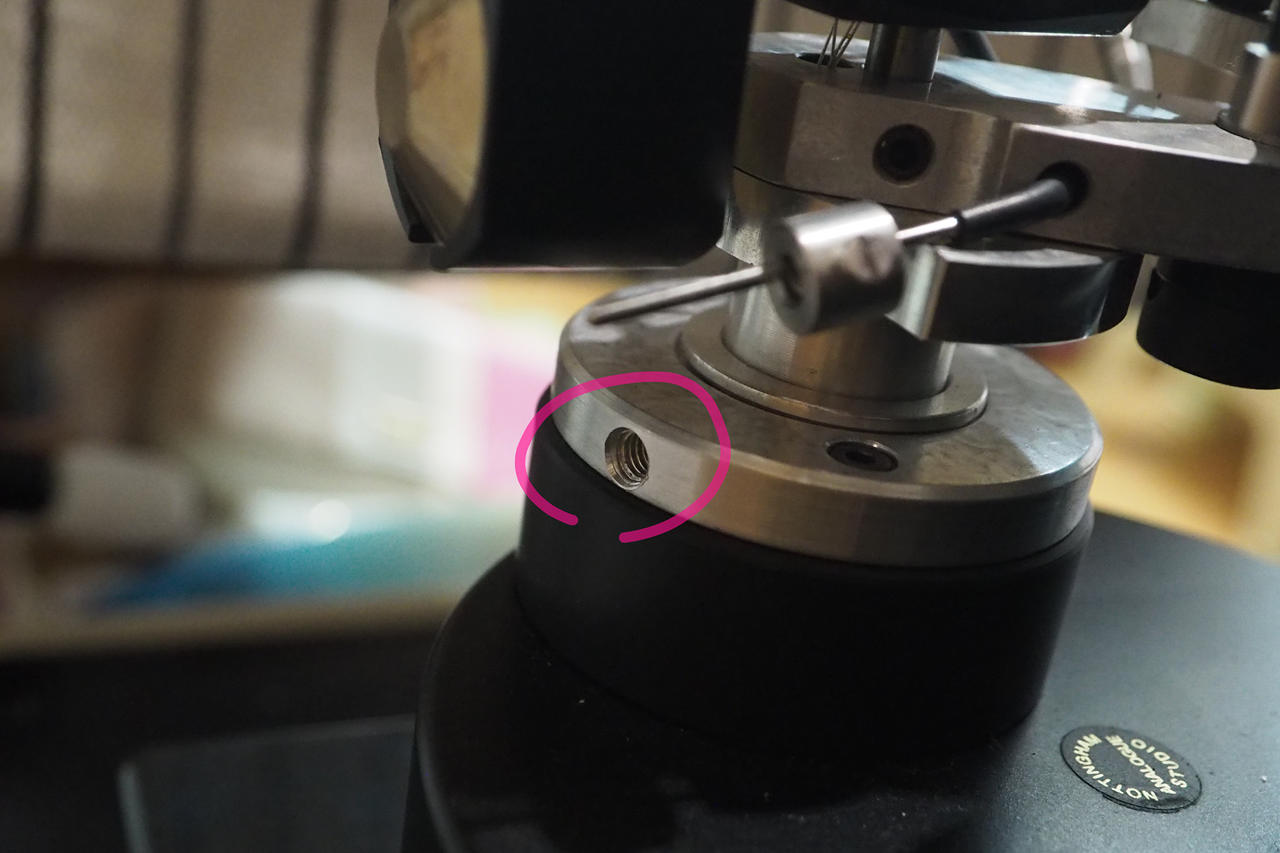 Nottighamのアームは、カウンターウェイト下部に仕込まれた真鍮製のサブウェイトを前後にずらすことで針圧を微調整します。とても神経質で何度もやり直すことになり、日本のアーム例えばSAEC辺りの簡便さに比べるととても原始的です。しかし、針圧計しか頼れるものがないのだから、常に正確に針圧を調整する慣習にもなるし、私は儀式としてなかなか良い造作なのではないかと思っています。