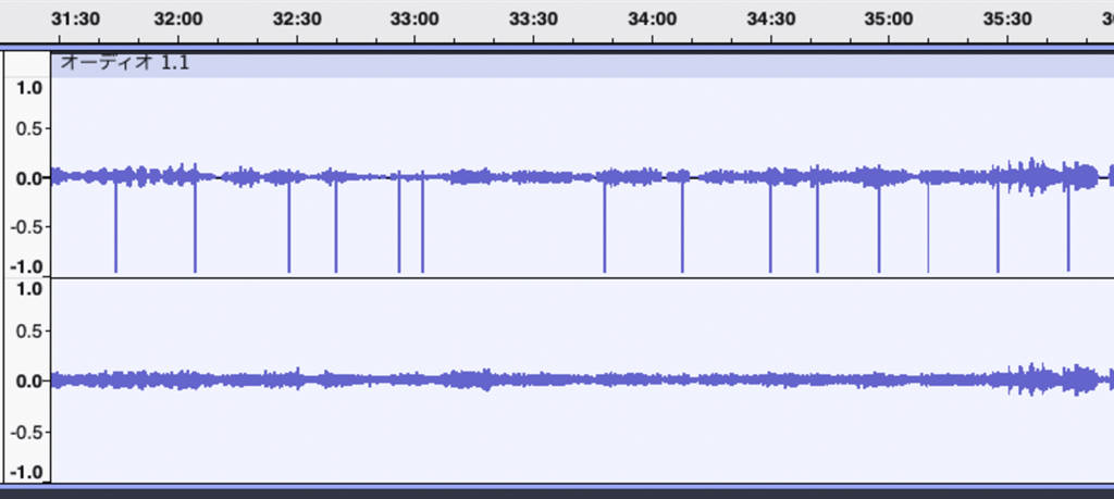 この傷音はA面のほぼ全域に渡って見られ(つまり長い傷)、B面には見られません。これだけ大量の傷跡だとスクラッチ除去は難しいのでこのまま諦めます。Roon(Qobuz)にはディジタルソースも転がっていますし。傷音が嫌ならそちらを聞けばよい。