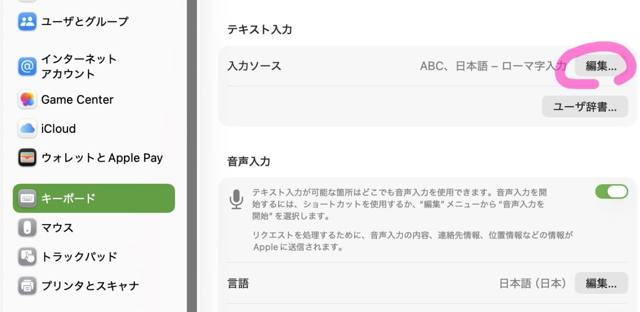 Macの「システム設定」から「キーボード」「入力ソース」「編集」を選びます。