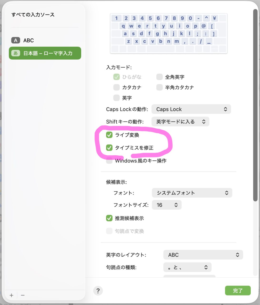 図のところ「ライブ変換」や「タイプミスを修正」をOFFにします。